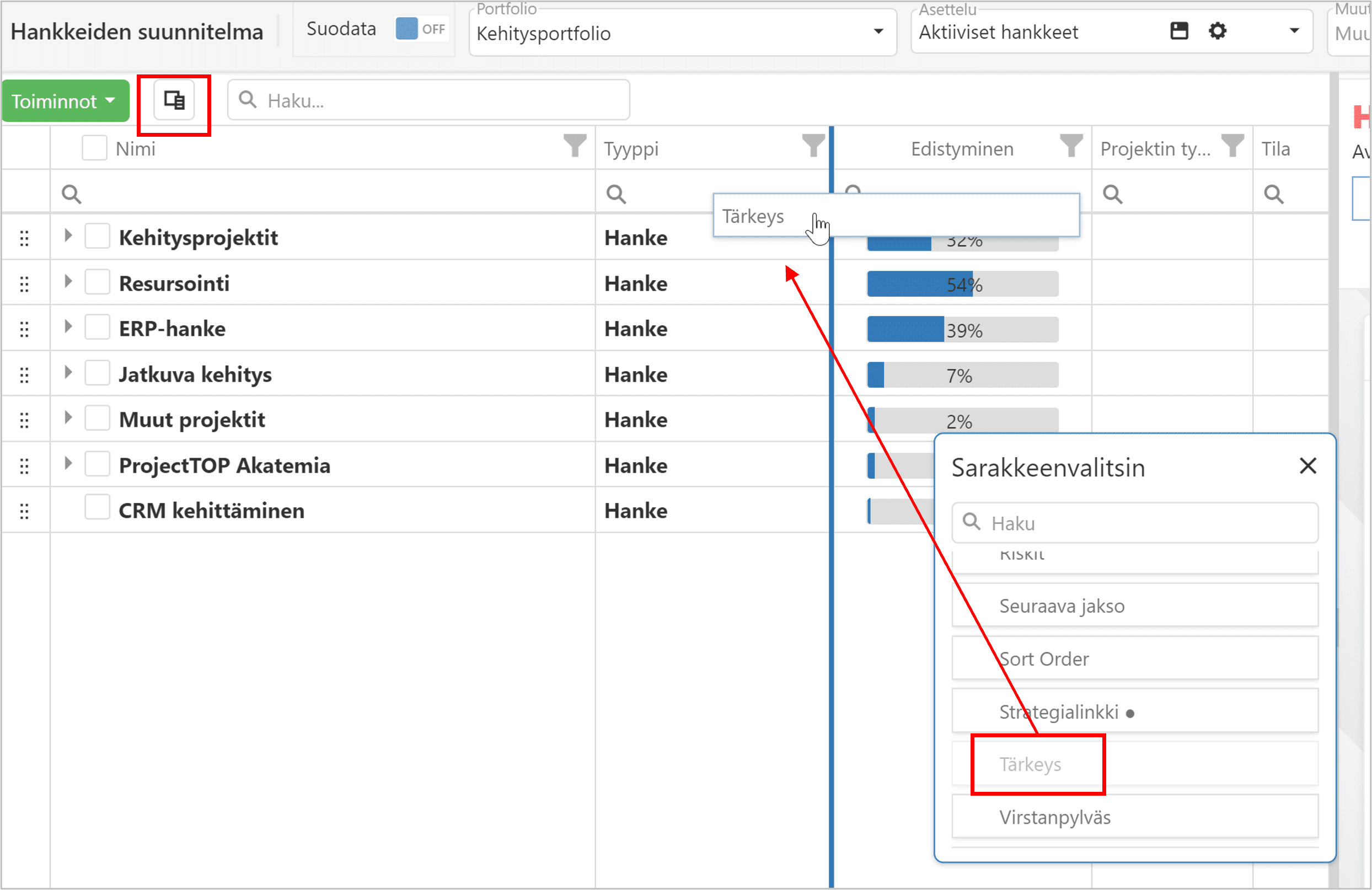 Valitse näytettävät sarakkeet sarakevalitsimesta. Raahaa haluamasi sarakkeet paikalleen. Voit myös järjestellä sarakkeita ottamalla otsikosta kiinni ja viemällä haluamaasi kohtaan.