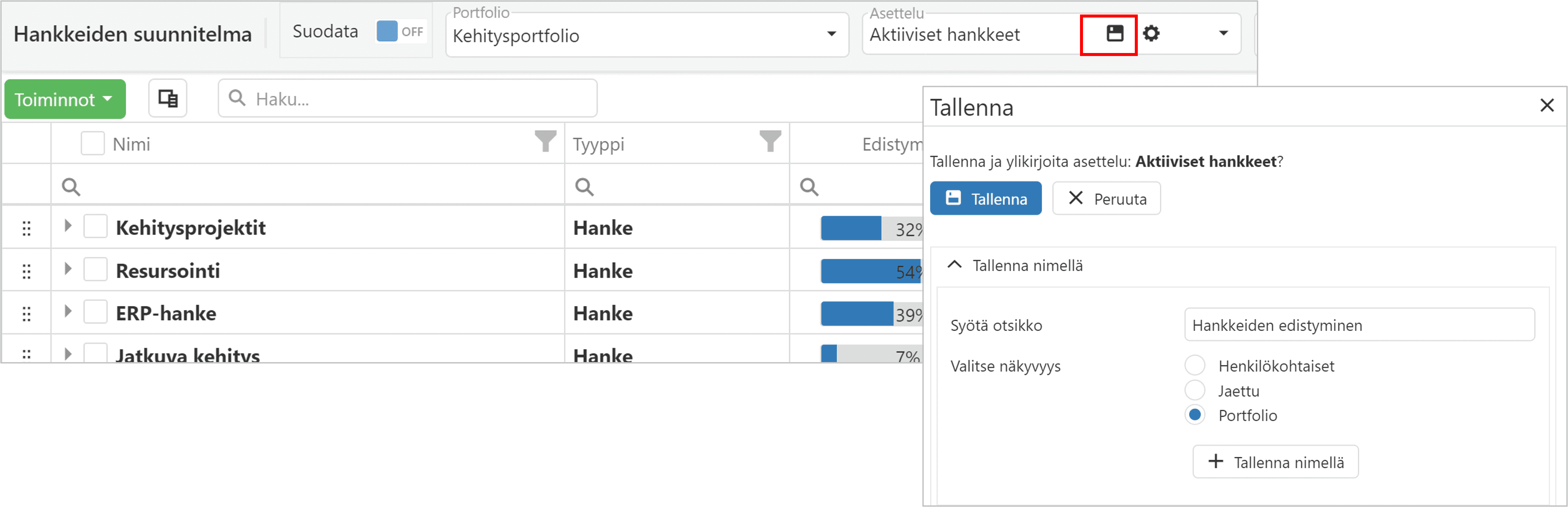 Voit suodatuspainikkeesta valita hankkeita sekä suodattaa menneet, käynnissä olevat tai tulevat projektit. Voit myös piilottaa näkymästä suljettuja hankkeita ja projekteja sekä valmiita vaiheita ja aktiviteetteja.