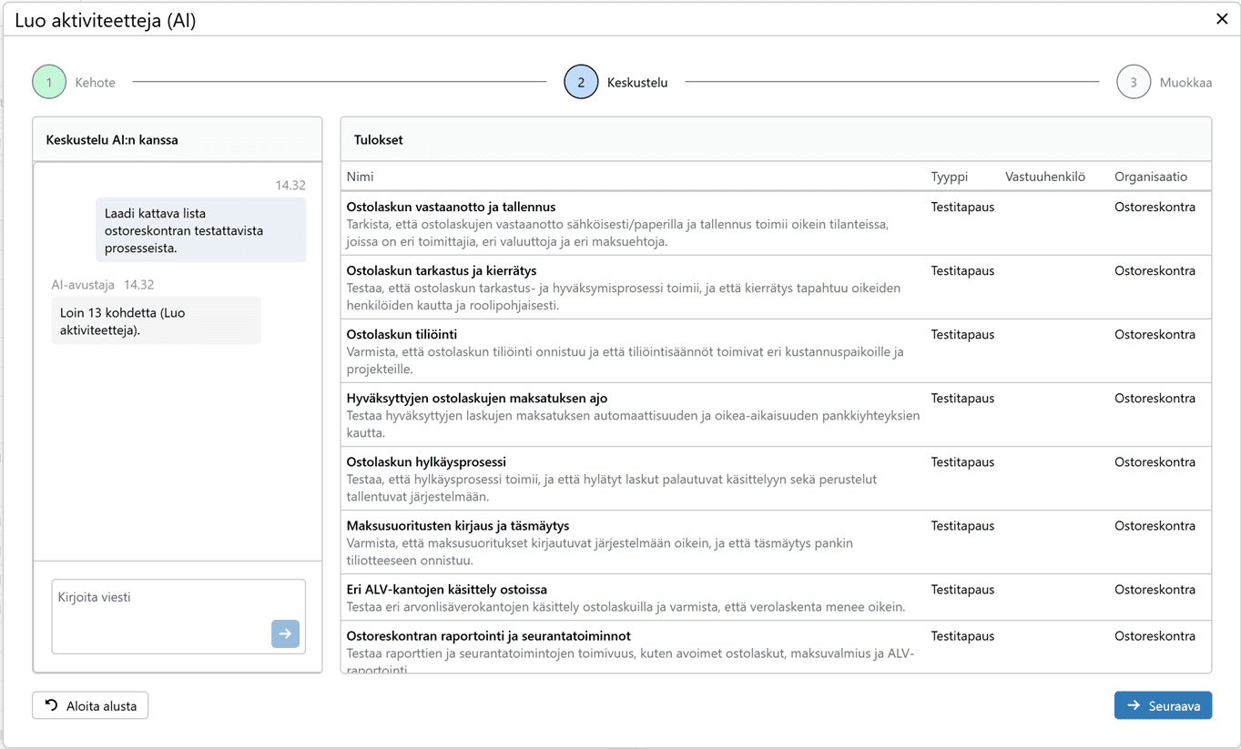 Tekoäly valmistelee pyynnön mukaiset testitapaukset otsikkotasolla. Voit käydä tekoälyn kanssa keskustelua ja pyytää sitä tekemään muutoksia testitapauksiin.