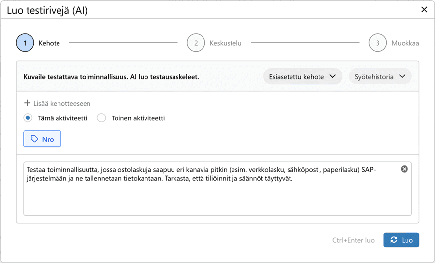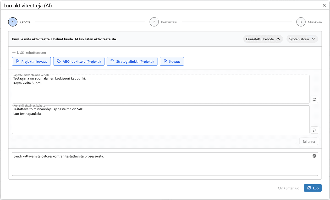 Projektin esiasetuksiin voidaan määritellä roolit, jolloin tekoäly osaa kohdistaa testit eri käyttäjäprofiileille. Lisäksi voit määritellä testirivien tarkkuustason ja kielen. Jos testitapaukset on tuotettava esimerkiksi englanniksi, riittää että pyydät tekoälyä kääntämään ne halutulle kielelle tai asetat sen projektin esiasetuksiin.