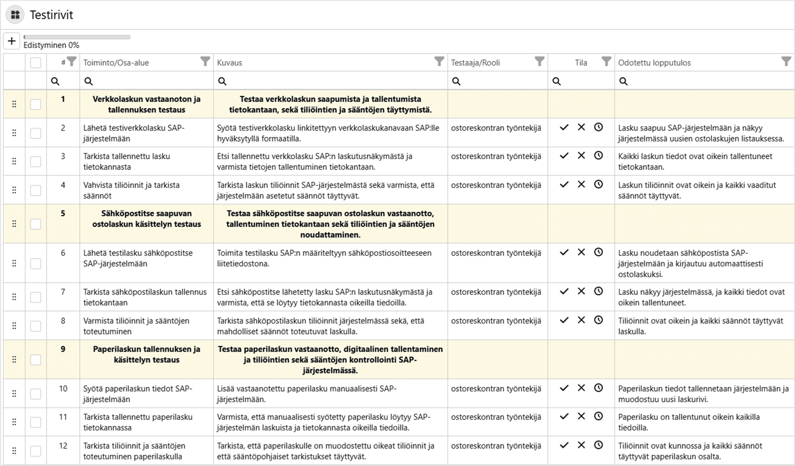 Listaus on hyvä tarkistaa ja tehdä tarvittavat korjaukset. Testitapausten monistaminen eri variaatioiksi kannattaa yleensä tehdä vasta sen jälkeen, kun testitapausten rivit on muodostettu. Näin työmäärä pysyy pienempänä.