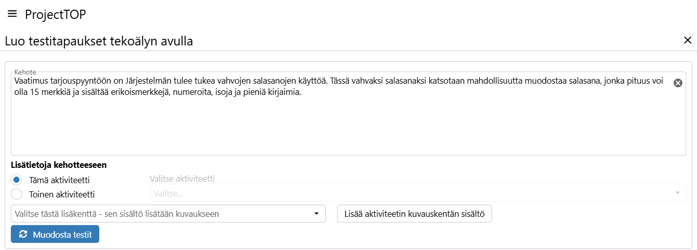 Alla esimerkki, kuinka helposti vaatimuksista voi luoda testitapauksia ProjectTOPilla tekoälyn avulla.