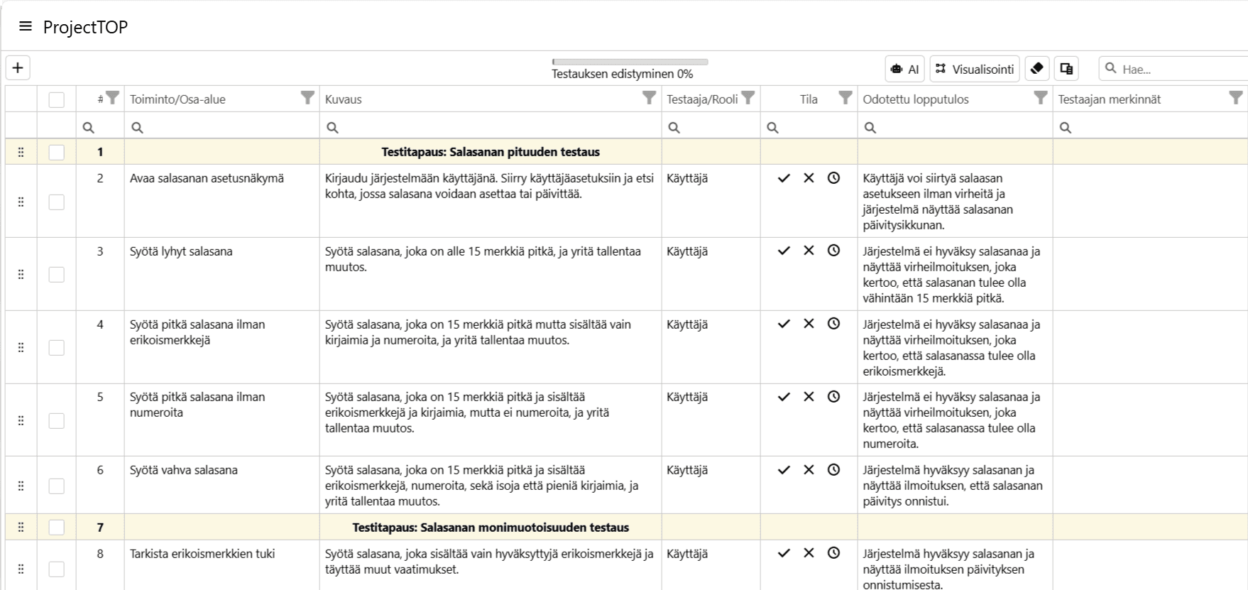 Voit muokata testitapausta, lisätä ja poistaa rivejä haluamasi mukaisesti.