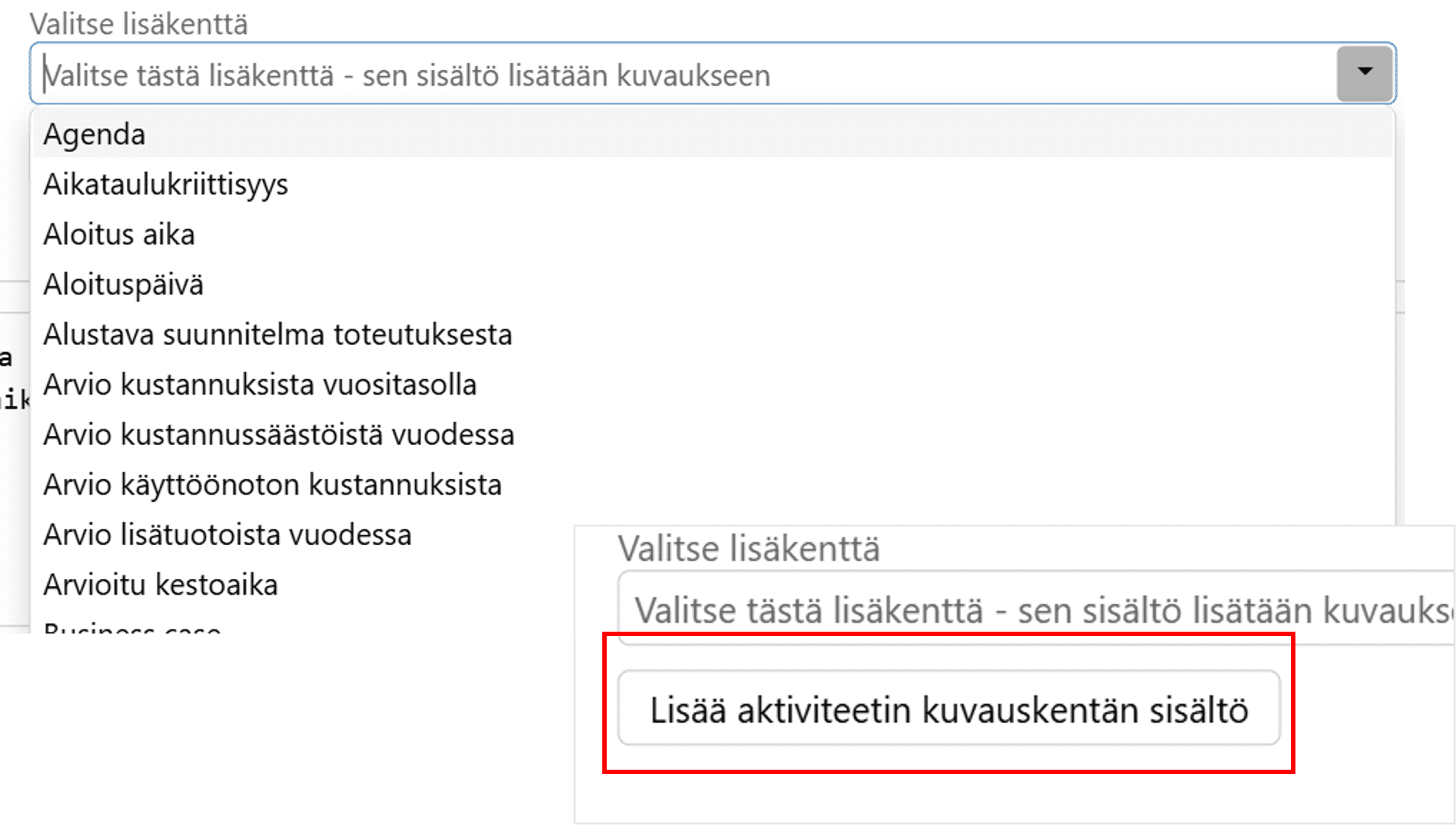 Voit valita testitapaukselle lisäkentän, jonka sisältö lisätään kehotteen kuvaukseen. Voit myös klikata Lisää aktiviteetin kuvauskentän sisältö, jos haluat lisätä kehotteeseen valitun aktiviteetin kuvauskentän sisällön.