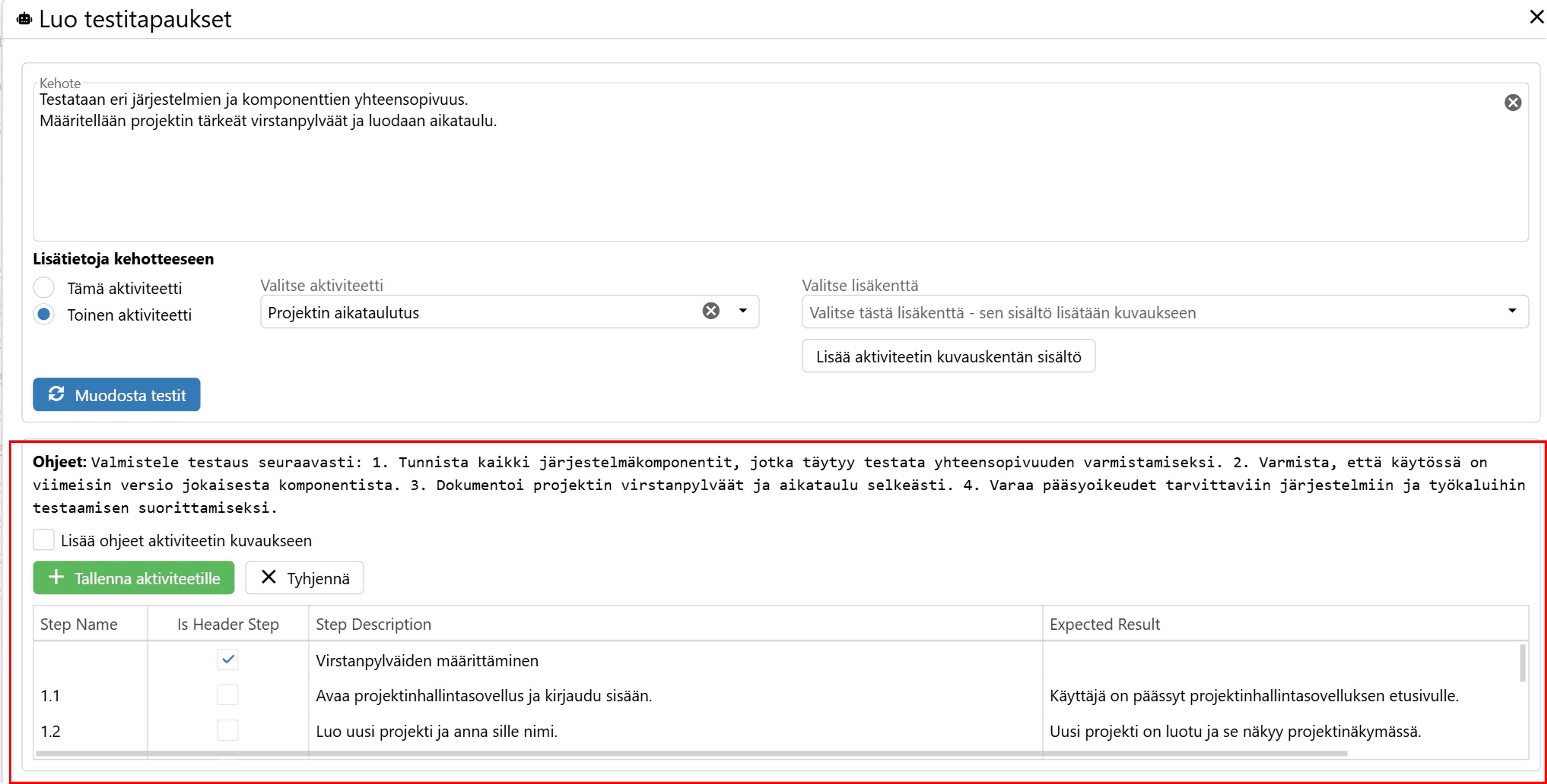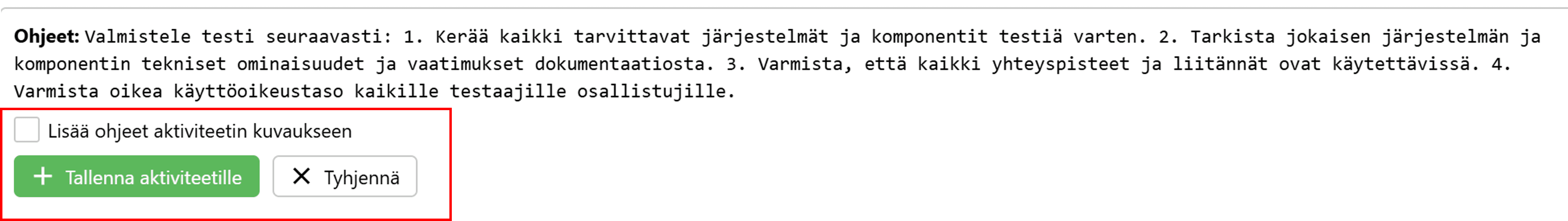 Esikatseluun muodostuvat myös ohjeet, jotka voit halutessasi lisätä aktiviteetin kuvaukseen klikkaamalla Lisää ohjeet aktiviteetin kuvaukseen. Voit nyt klikata Tallenna aktiviteetille, jolloin testitapaukselle muodostuvat testirivit esikatselun mukaisesti. Voit myös tarvittaessa tyhjentää näkymän klikkaamalla Tyhjennä.