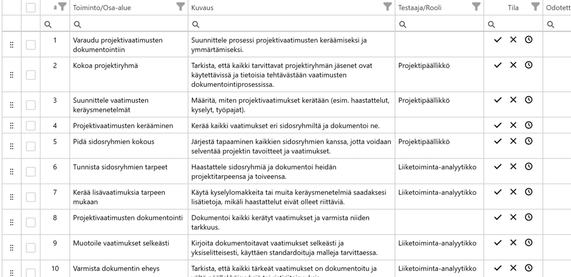 ProjectTOP Ain avulla voit luoda testirivit  tai prosessikuvauksen antamiesi tietojen perusteella.