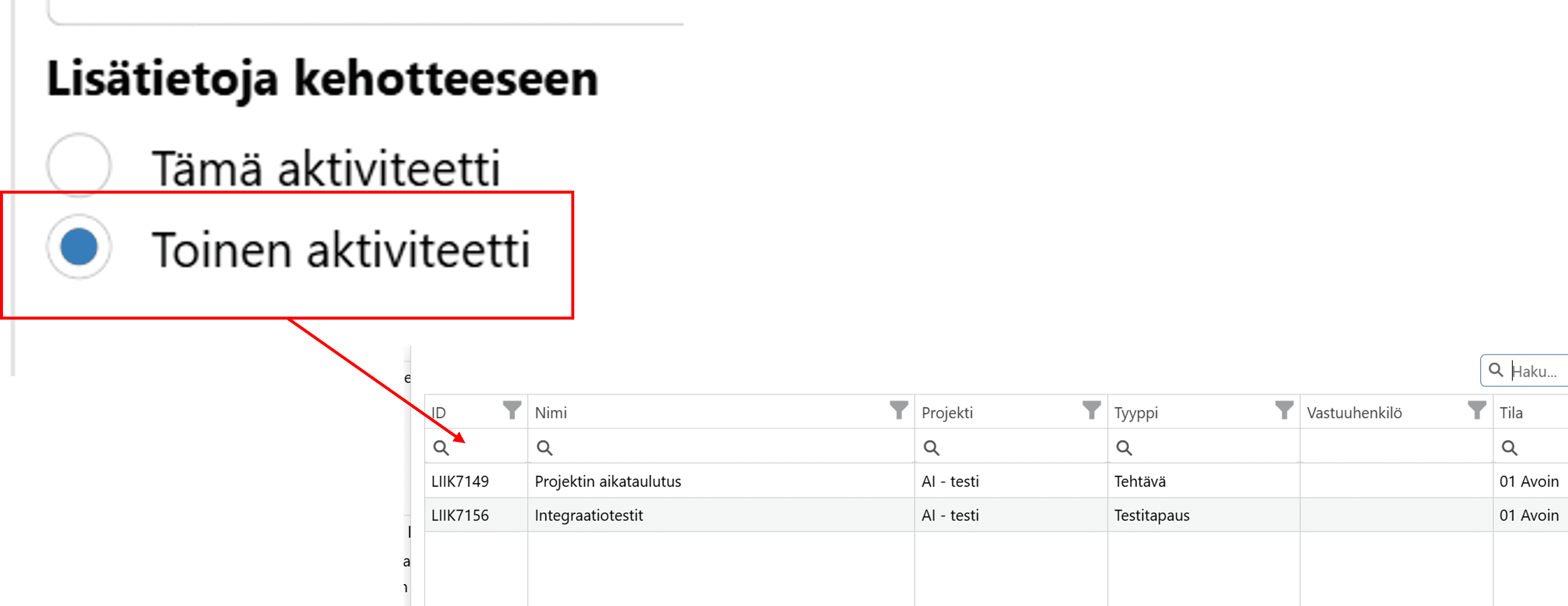 Jos haluat lisätä testitapaukselle myös toisen aktiviteetin tietoja, laita täppä kohtaan Toinen aktiviteetti. Pääset valitsemaan haluamasi aktiviteetin valikosta.