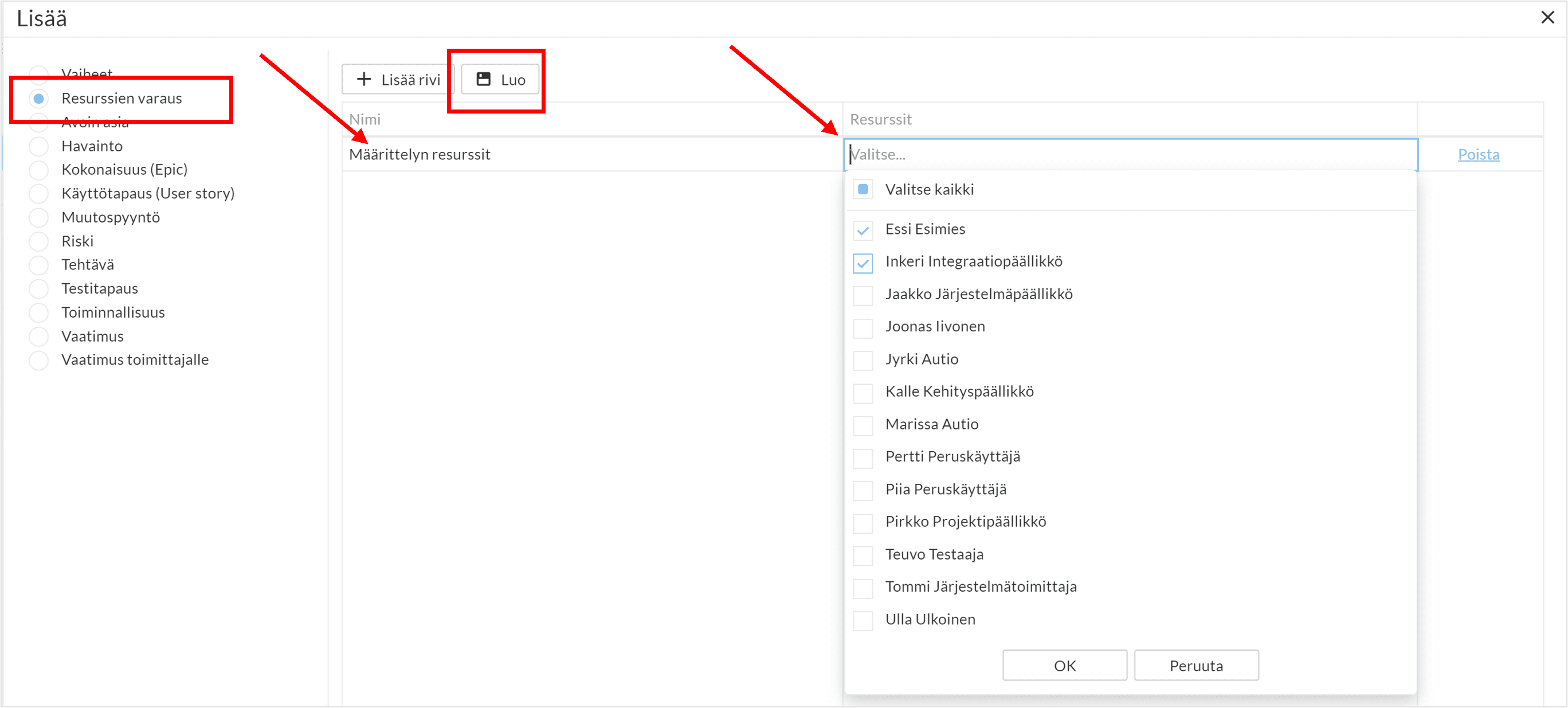 Valitse tyypiksi ”Resurssien varaus” ja anna riville nimi. Resurssivarauksen luonnin yhteydessä voi lisätä resursseja, mutta ne voidaan lisätä myös myöhemmin. Luo varaus.