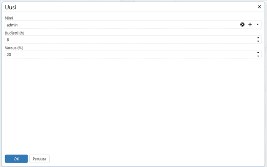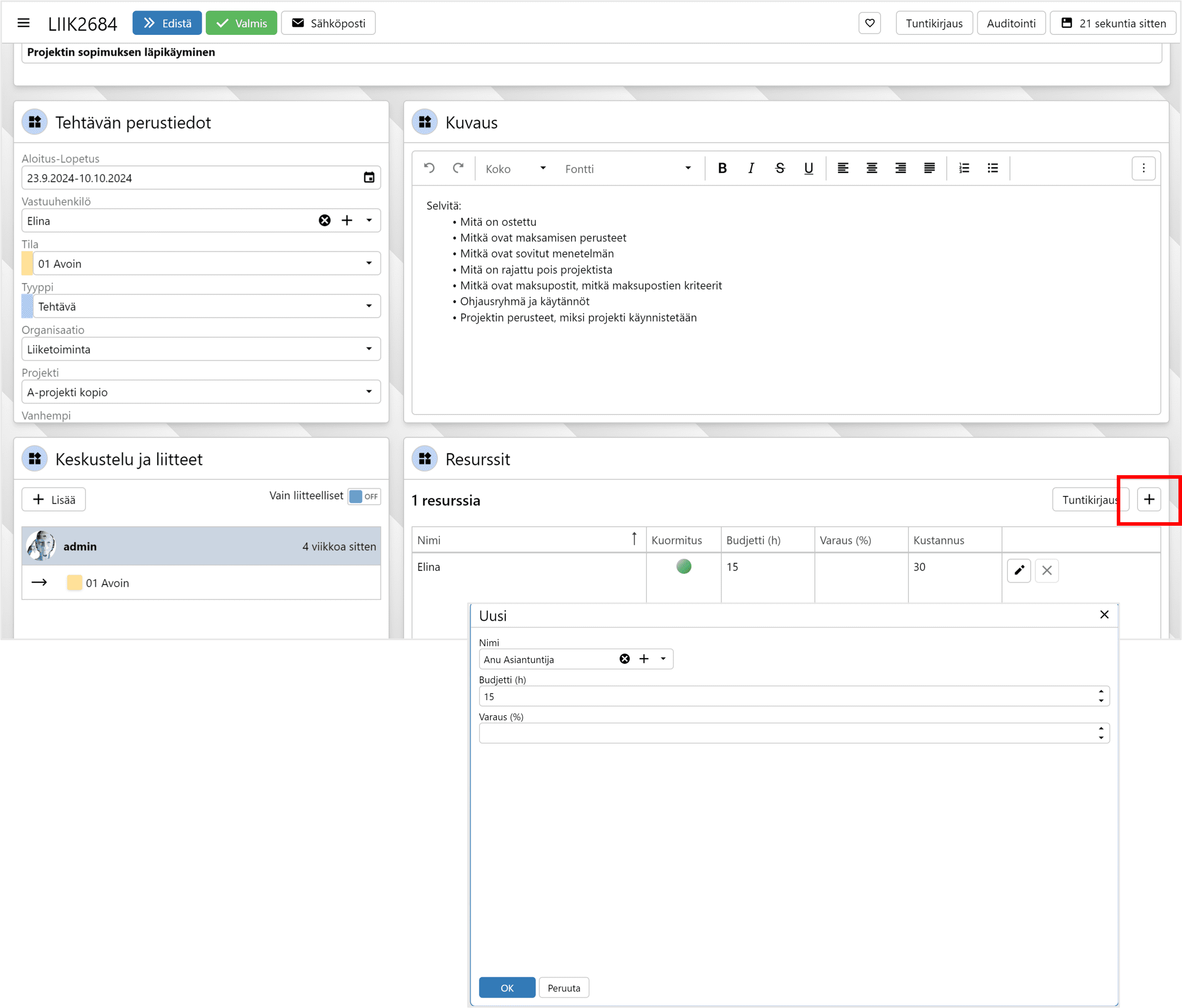 Valitse tai luo uusi aktiviteetti, jolle haluat suunnitella resursseja. Lisää resurssi + painikkeesta ja anna budjetti tunteina tai prosenttina. Varmista, että aktiviteetissa on aloitus- ja lopetuspäivä.