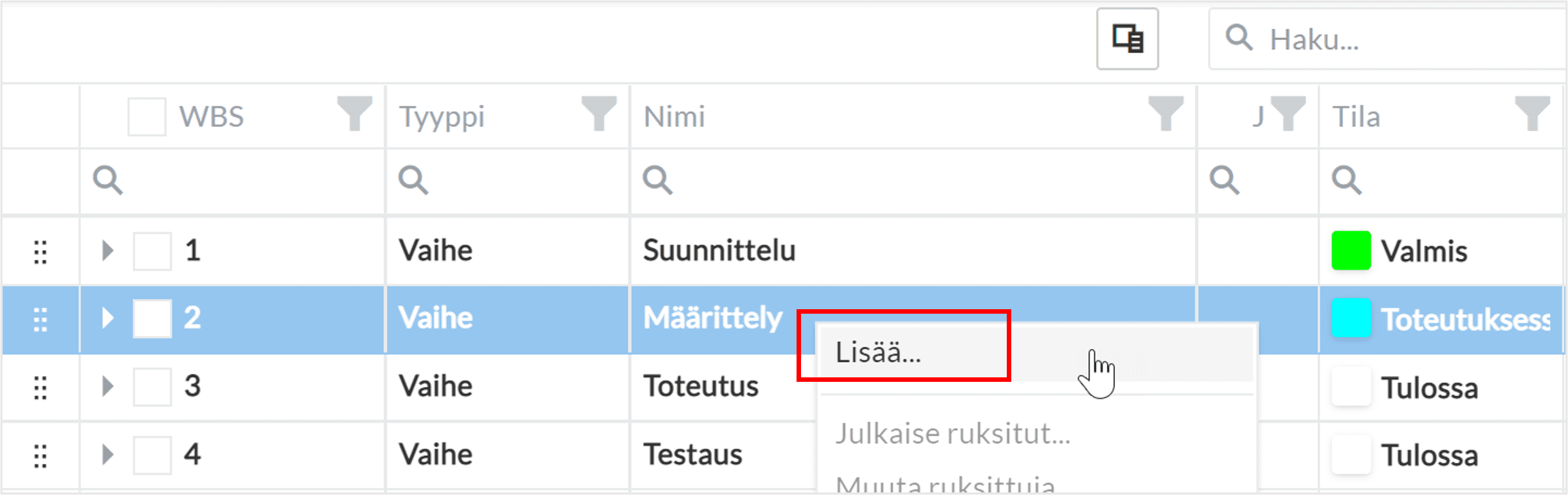 Siirry projektin suunnitelmaan. Valitse projektin vaihe, jonka alle haluat suunnitella resursseja. Lisää hiiren oikean painikkeen valikon kautta uusi resurssi.