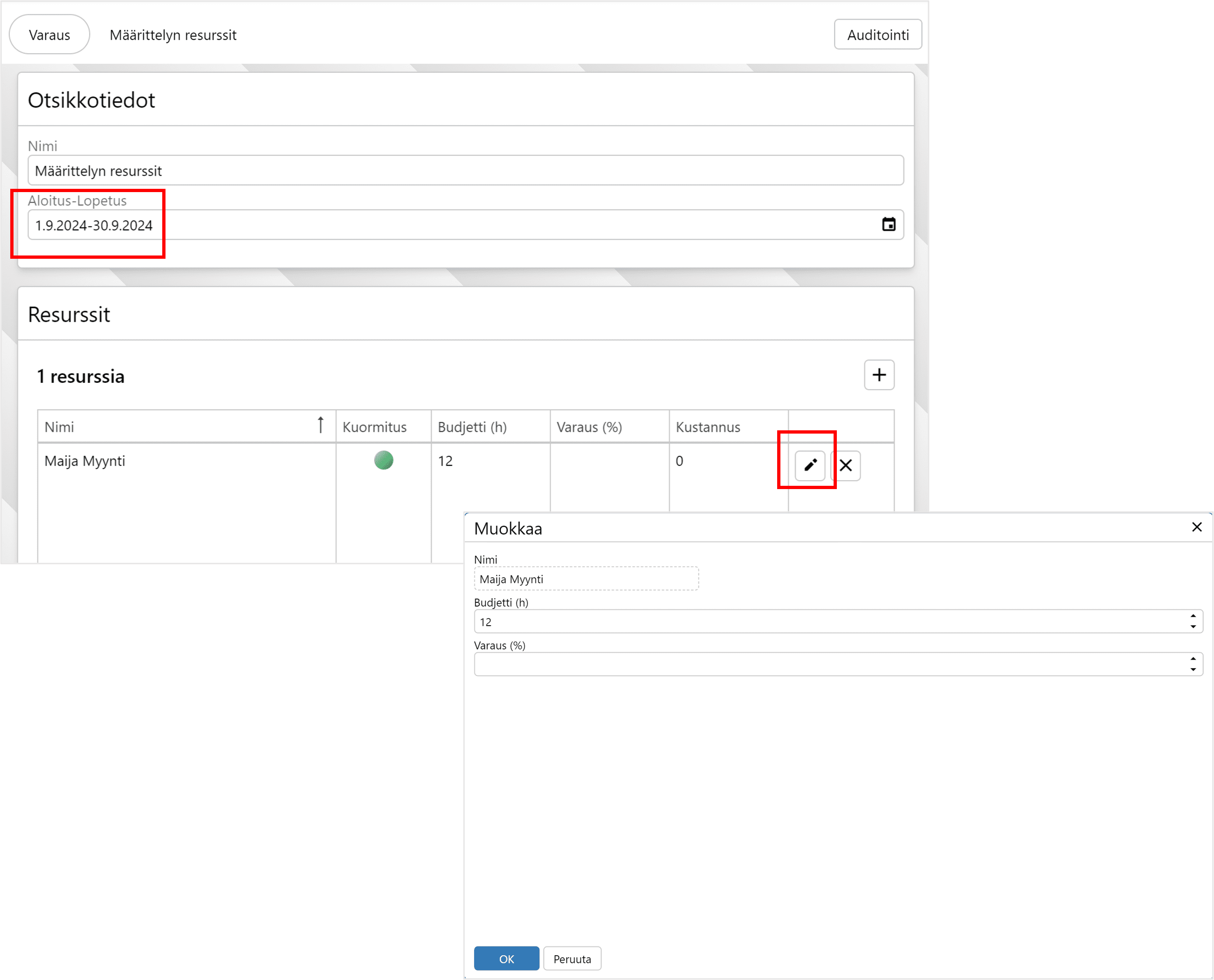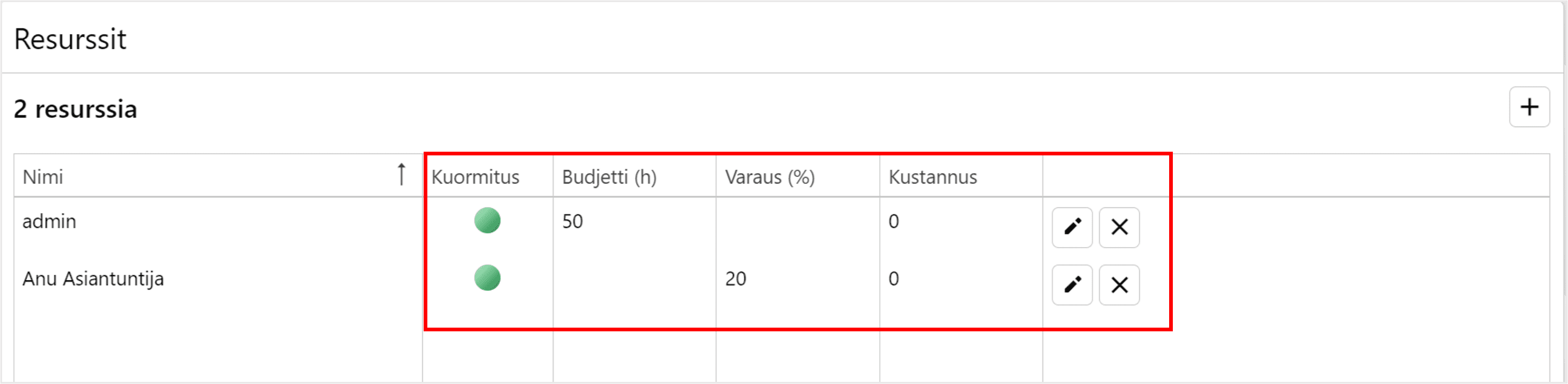 Resurssit widgetissä näet resurssien kuormituksen, budjetin/varauksen ja kustannuksen. Voit muokata resurssivarausta kynästä tai poistaa ruksista.