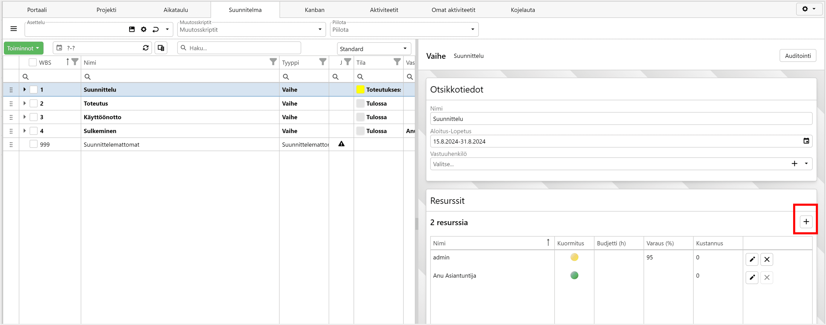 Siirry projektin suunnitelmaan. Valitse projektin vaihe, jolle haluat lisätä resursseja ja klikkaa Resurssit-widgetissä + painiketta.