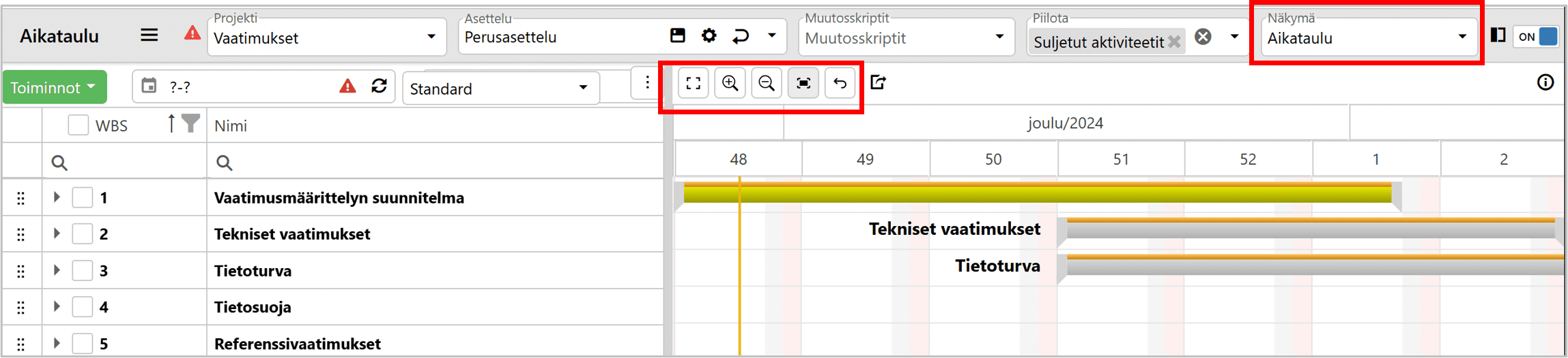 Voit tarkastella projektin aikataulua Aikataulu-näkymässä klikkaamalla valikosta tai välilehteä ”Aikataulu”.
