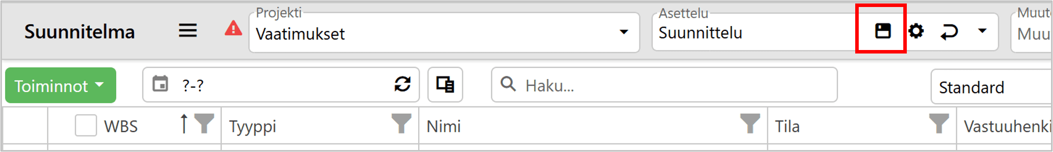Voit tallentaa asettelun klikkaamalla ”Tallenna” painiketta. Valitse tallennatko vanhan asettelun päälle vai tallennatko uuden asettelun.