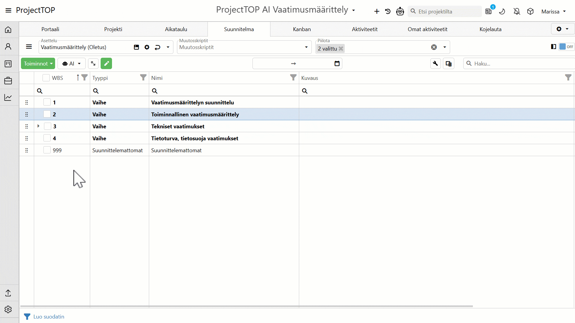 ProjectTOP tukee myös projektin suunnittelua: voit luoda vaatimusmäärittelyn rakenteen valmistellun projektipohjan avulla ja asettaa mukaan vakio- tai tekniset vaatimukset. Tekoäly auttaa tarvittaessa – antamalla sille vinkin osa-alueesta saat nopeasti luonnoksen määrittelysuunnitelmasta.