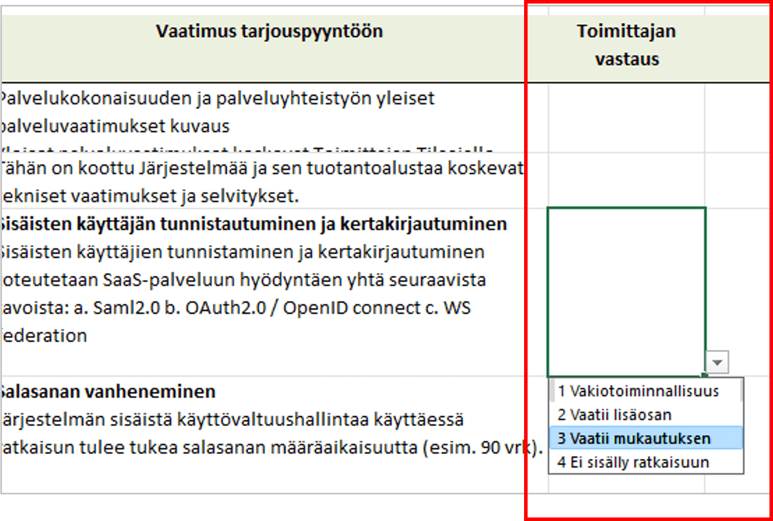 Toimittaja valitsee Excelissä vastauksen suoraan alasvetovalikosta, jonka valinnat tulevat ProjectTOPin kentän alasvetovalikosta.