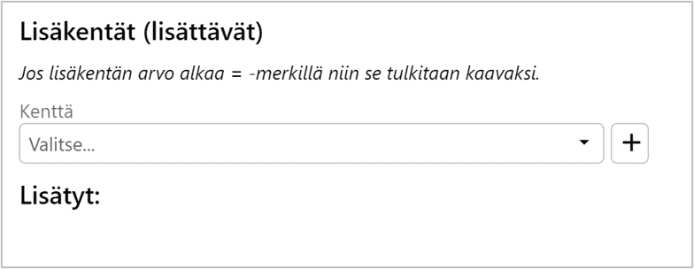 Lisäkentät (lisättävät)-kohdassa voit lisätä Exceliin ladattavia kenttiä. Valitse kenttä ja klikkaa + merkistä.