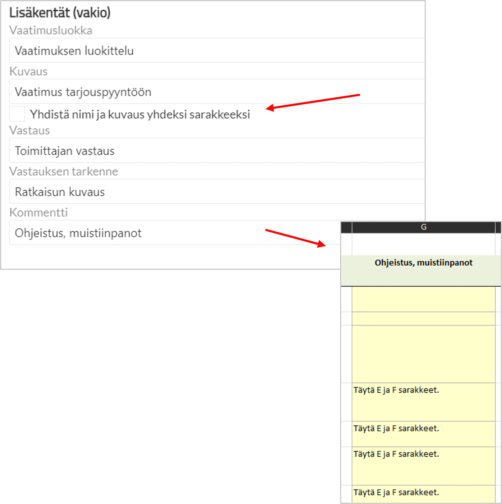 Selite toimii esimerkiksi ohjerivinä Excelin täyttämistä varten. Kuvaus on kursivoitu.