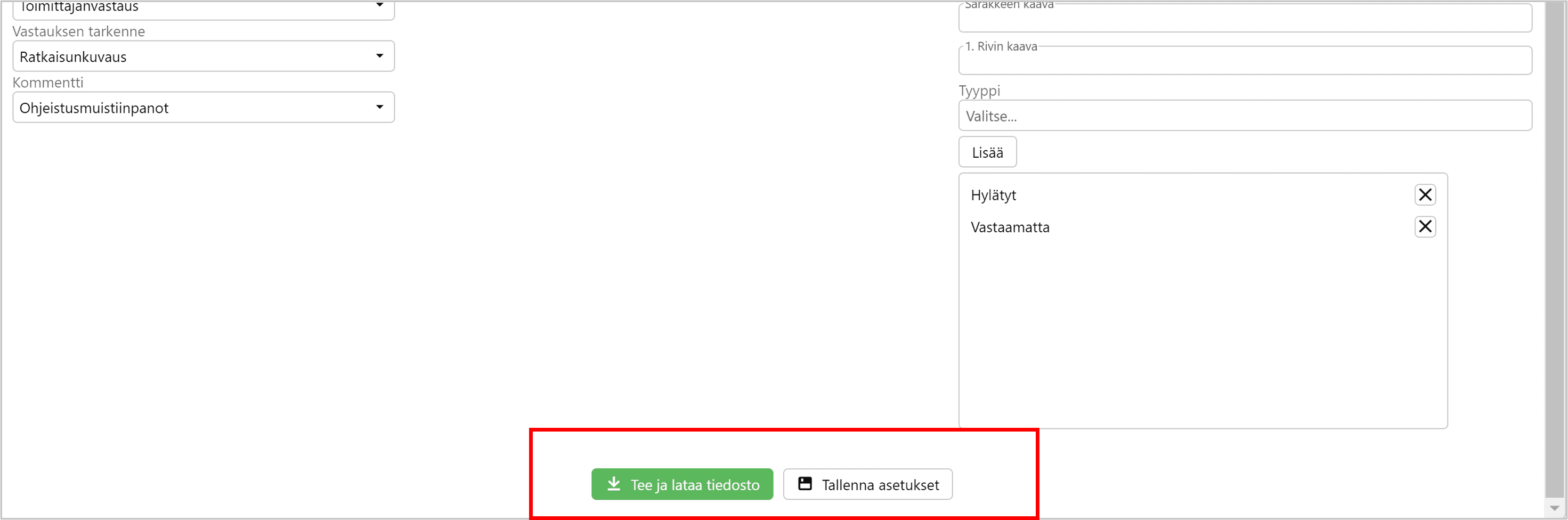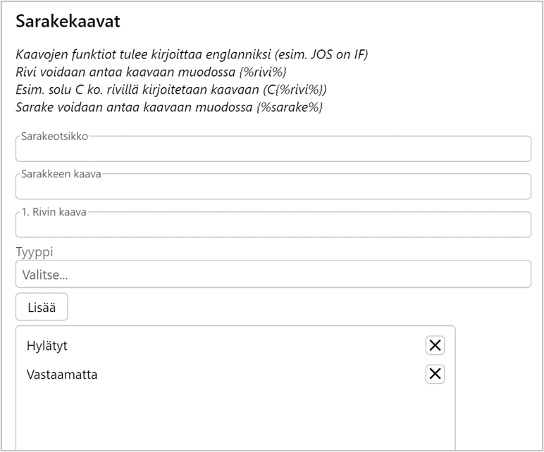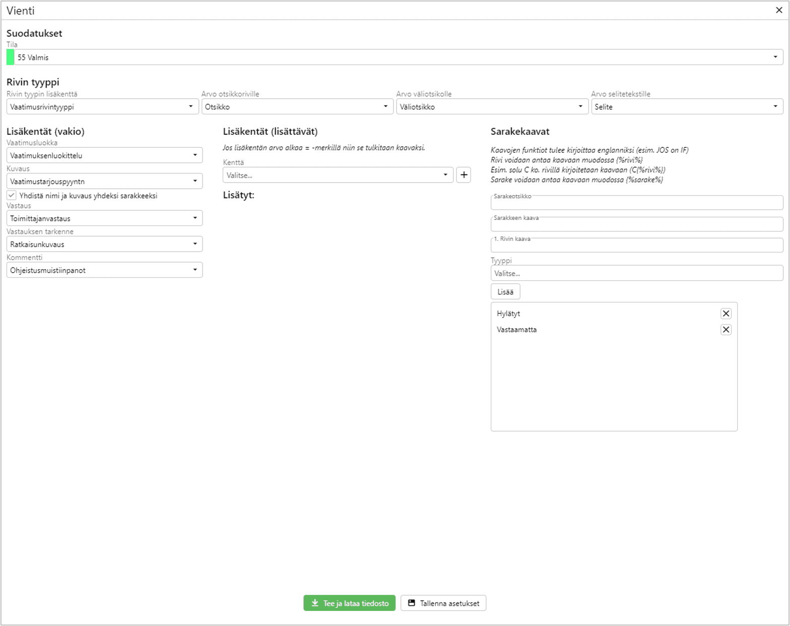Sarakekaavat-kohdassa voit lisätä Exceliin tuotavia kaavoja esimerkiksi laskenta hylätyistä pakollisista vaatimuksista tai kuinka moneen vaatimukseen toimittaja ei ole vastannut.