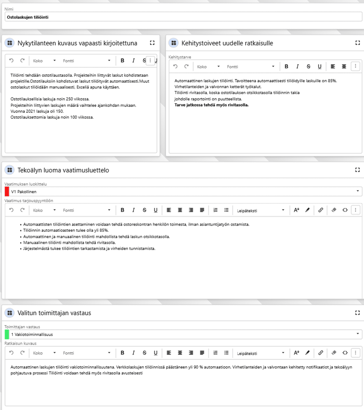Alla esimerkkikuva on hankinnan aikana työstetystä vaatimusmäärittelystä, johon olen ladannut voittaneen toimittajan vastaukset. Kun käytettävissä ovat kaikki määrittelyvaiheen tuotokset, myös muiden kuin määrittelyyn osallistuneiden on helppo ymmärtää, miten testaus tulisi suorittaa.
