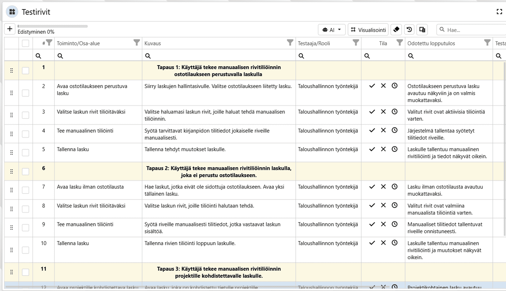 Alla olevassa kuvassa tekoäly on luonut testirivit. Vaikka tuotos on yleensä laadukas, tulee testitapausten rivit tarkistaa ennen varsinaisen testauksen aloittamista.