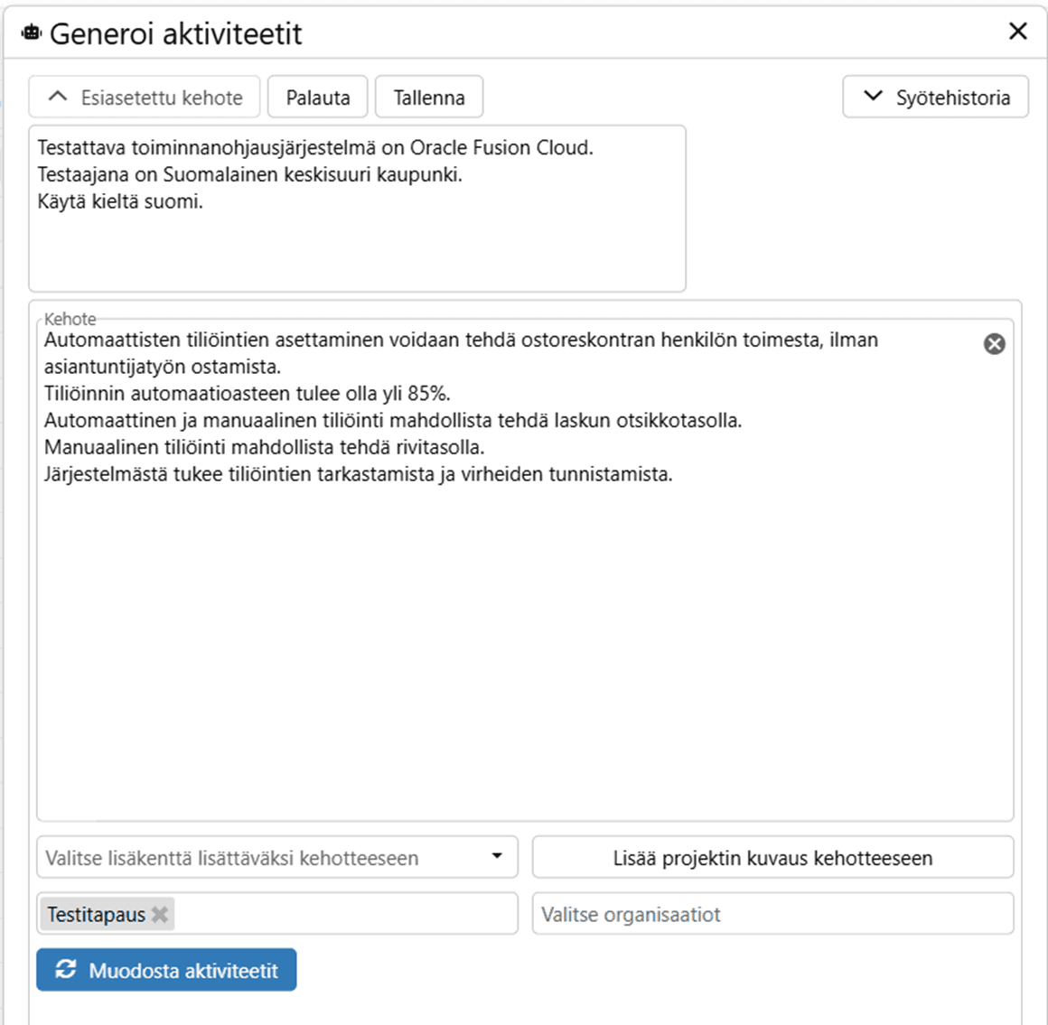 ProjectTOP AI on tehnyt alustavan kuvauksen testauksesta, jonka perusteella testitapauksen rivit voidaan muodostaa. Tekstiä kannattaa kuitenkin rikastaa omalla asiantuntemuksella tai vaatimusmäärittelyn aikana käytyjen keskustelujen pohjalta.