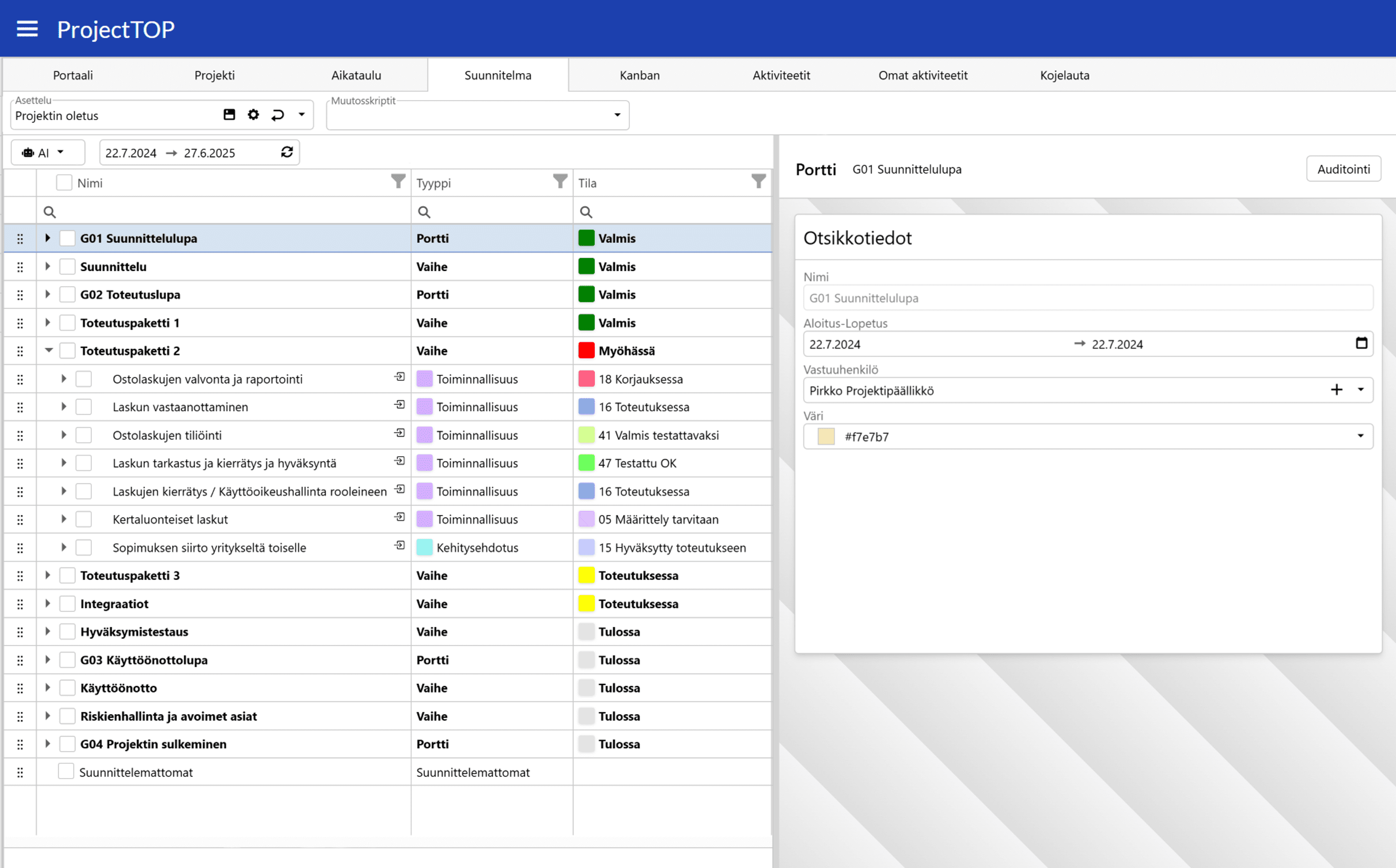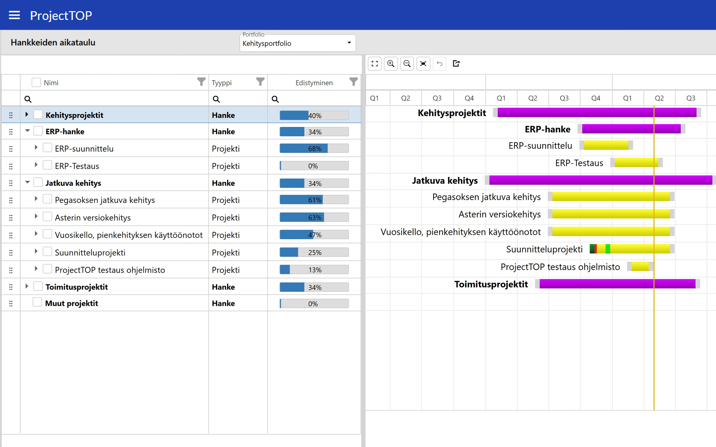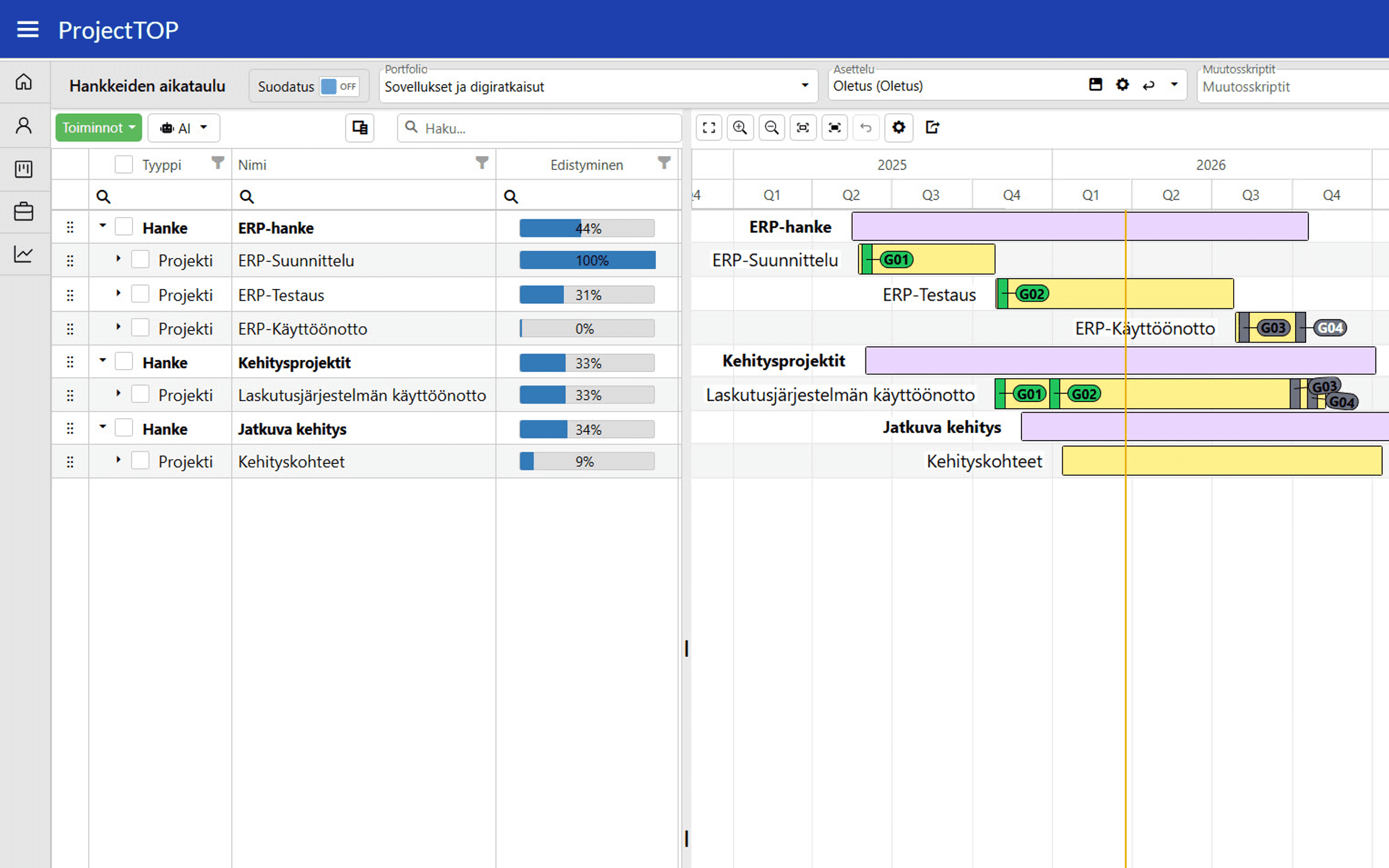 Portfolionäkymä kokoaa yhteen kaikki käynnissä olevat projektit ja näyttää niiden tilan, aikataulut, budjetin ja resurssien käytön yhdellä silmäyksellä. Näkymä antaa johdolle, PMO:lle ja projektipäälliköille selkeän ja ajantasaisen kuvan, mitkä projektit etenevät suunnitellusti ja missä tarvitaan toimenpiteitä.