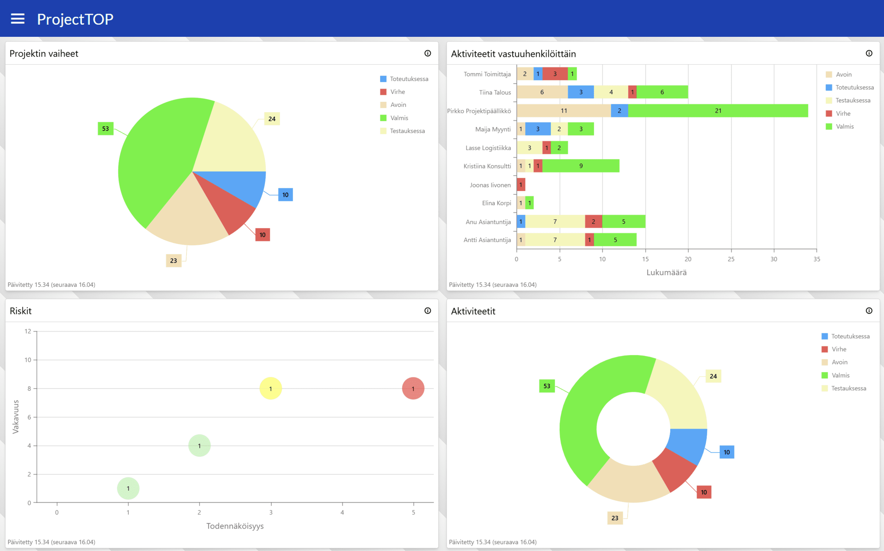ProjectTOP on monipuolinen projektinhallintaohjelmisto, joka tuo suunnittelun, seurannan ja ohjauksen yhteen paikkaan. Se tehostaa projektityötä, selkeyttää viestintää ja auttaa pitämään kokonaisuudet hallinnassa. PMO saa reaaliaikaisen näkyvyyden koko organisaation projekteihin ja ProjectTOP AI automatisoi rutiinityötä, tuottaa valmiita sisältöjä sekä auttaa ennakoimaan riskit ja poikkeamat. Näin suuret IT-hankkeet etenevät hallitusti, aikataulussa ja budjetissa.